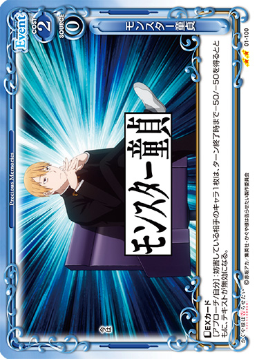 | 〔EXカード〕[アプローチ/自分]:妨害している相手のキャラ1枚は、ターン終了時まで-50/-50を得るとともに、テキストが無効になる。 | ||