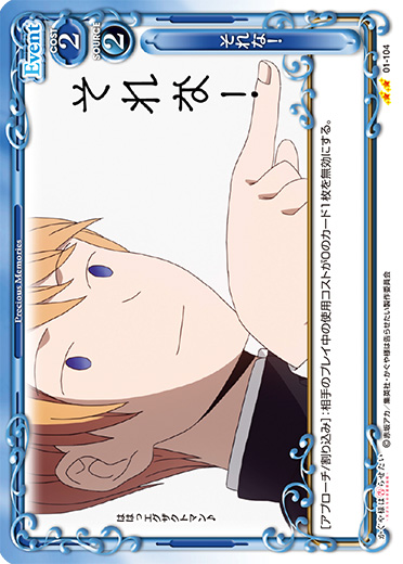 | [アプローチ/割り込み]:相手のプレイ中の使用コストが0のカード1枚を無効にする。 | ||