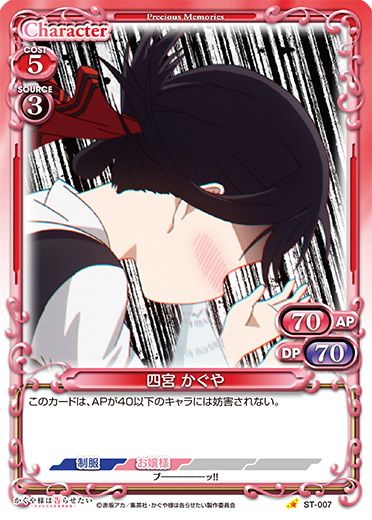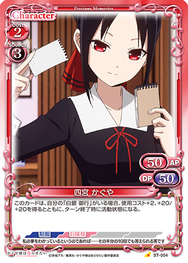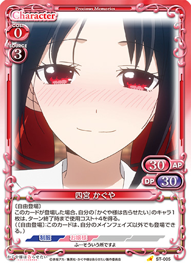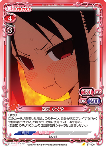 | 〔我慢〕このカードが登場した場合、このターン、自分が次にプレイする『かぐや様は告らせたい』のキャラ1枚は、使用コスト-4を得る。(〔我慢〕:DPが10以上の〔我慢〕を持つキャラは、退場しない。) | ||