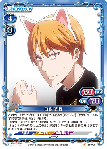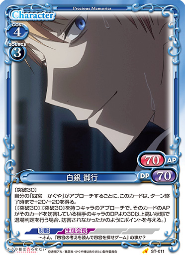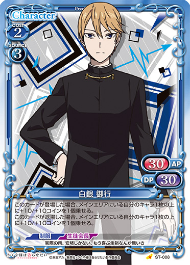 | このカードは、自分の「白銀 御行」がいる場合、使用コスト+2、+20/+20を得るとともに、ターン終了時に活動状態になる。 | ||