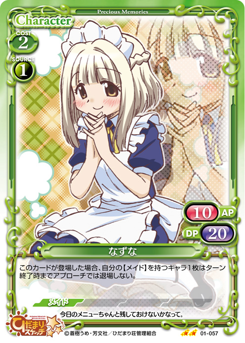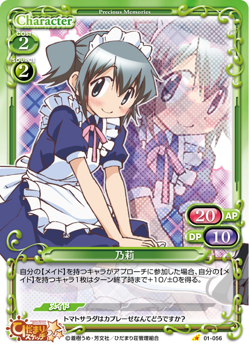 | 自分の【メイド】を持つキャラがアプローチに参加した場合、自分の【メイド】を持つキャラ1枚はターン終了時まで+10/±0を得る。 | ||