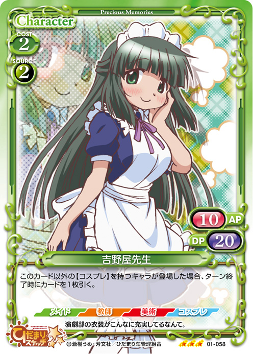| このカードが登場した場合、自分の【メイド】を持つキャラ1枚はターン終了時までアプローチでは退場しない。 | ||