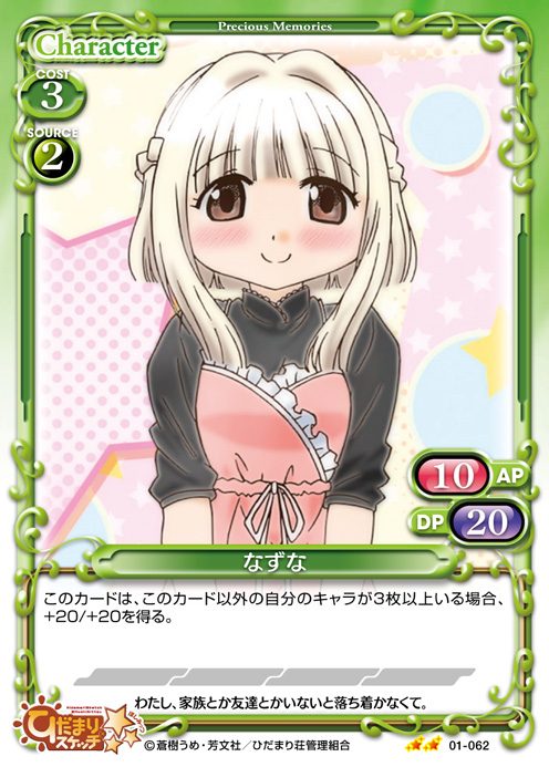 | このカードは、このカード以外の自分のキャラが3枚以上いる場合、+20/+20を得る。 | ||