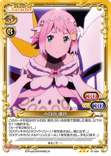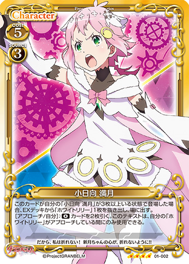 | このカードが自分の「小日向 満月」が3枚以上いる状態で登場した場合、EXデッキから「ホワイトリリー」1枚を抜き出し、場に出す。[アプローチ/自分]:《0》カードを2枚引く。このテキストは、自分の「ホワイトリリー」がアプローチしている間にのみ使用できる。 | ||