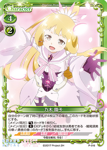 | 自分のターン終了時に手札が4枚以下の場合、このカードを活動状態にする。[メイン/両方]:《休》カードを1枚引く。[メイン/自分]:《1》EXデッキから『結城友奈は勇者である -鷲尾須美の章-/-勇者の章-』のカード1枚を抜き出し、手札に移す。 | ||