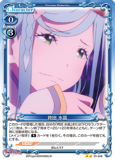 | このカードが登場した場合、自分の「袴田 水晶」または「ドロセラノクターン」1枚は、ターン終了時まで+20/+20を得るとともに、ターン終了時に活動状態になる。[メイン/相手]:《1》カードを1枚引く。その場合、このカードを捨て札にする。 | ||