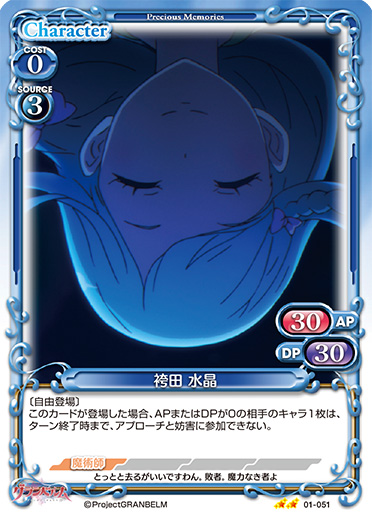 | 〔自由登場〕このカードが登場した場合、APまたはDPが0の相手のキャラ1枚は、ターン終了時まで、アプローチと妨害に参加できない。 | ||