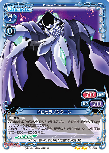 | 〔EXカード〕APまたはDPが0の全てのキャラはアプローチできず、自分の「ドロセラノクターン」を妨害できない。このカードがアプローチした場合、相手のキャラ1枚は、ターン終了時まで-200/-200を得る。 | ||