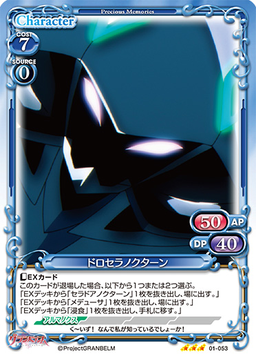 | このカードが登場した場合、カードを1枚引く。このカードが退場した場合、手札または自分の捨て札置き場にある「ドロセラノクターン」または「メデューサ」1枚を場に出すことができる。 | ||