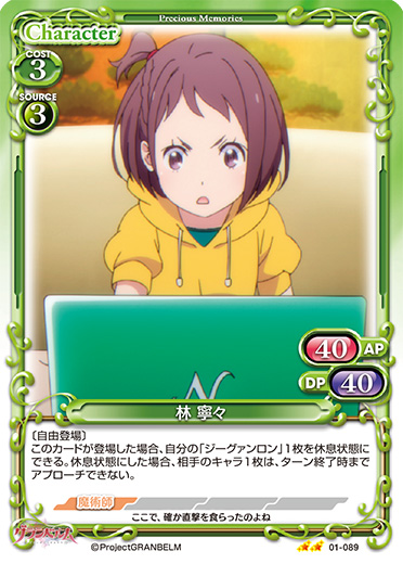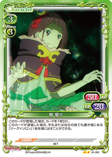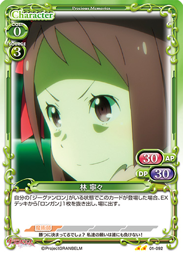 | このカードが登場した場合、自分のポイント置き場にあるカードを2枚まで表向きにできる。[メイン/自分]:《0》EXデッキから「ジーグァンロン」1枚を抜き出し、場に出す。その場合、このカードを捨て札にする。このテキストは、自分の「林 寧々」が3枚以上いる場合にのみ使用できる。 | ||