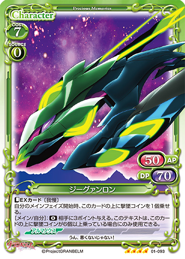 | 〔EXカード〕〔我慢〕自分のメインフェイズ開始時、このカードの上に撃墜コインを1個乗せる。[メイン/自分]:《0》相手に3ポイント与える。このテキストは、このカードの上に撃墜コインが6個以上乗っている場合にのみ使用できる。 | ||