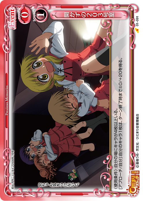 | 《使用条件》:自分の場にキャラが4枚以上いる。[アプローチ/自分]:自分のキャラ1枚は、ターン終了時まで±0/+20を得る。 | ||