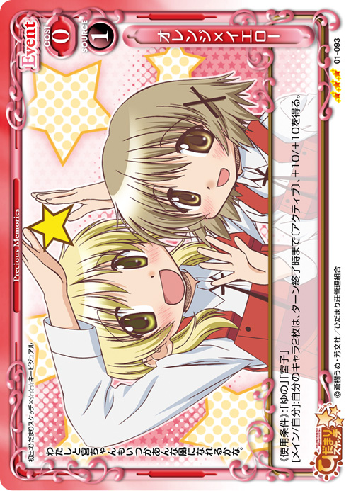 | 《使用条件》:「ゆの」「宮子」[メイン/自分]:自分のキャラ2枚は、ターン終了時まで〔アクティブ〕、+10/+10を得る。 | ||