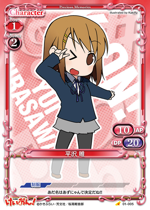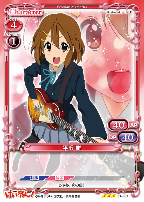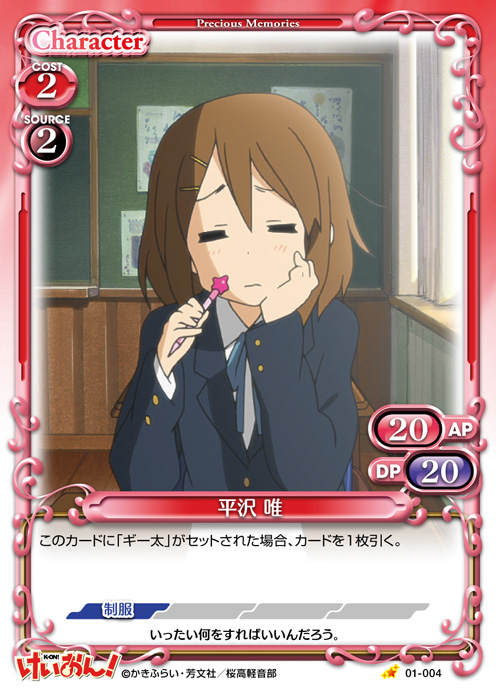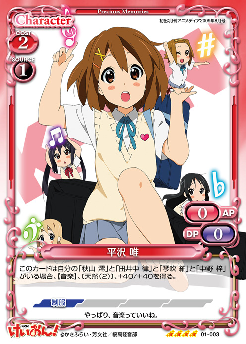 | このカードは自分の「秋山 澪」と「田井中 律」と「琴吹 紬」と「中野 梓」がいる場合、【音楽】、〔天然(2)〕、+40/+40を得る。 | ||