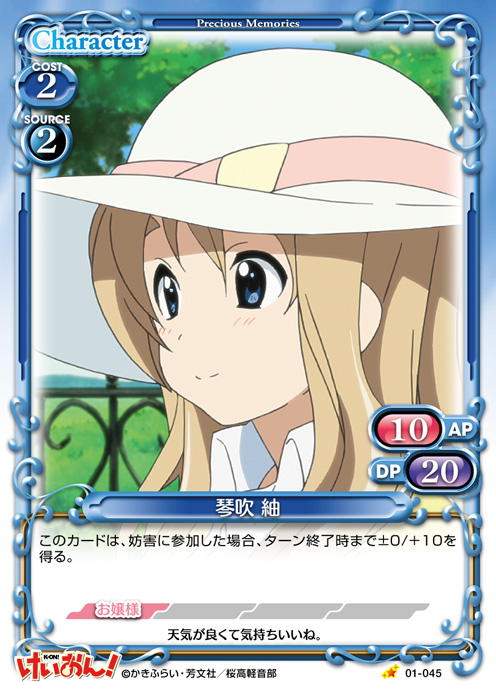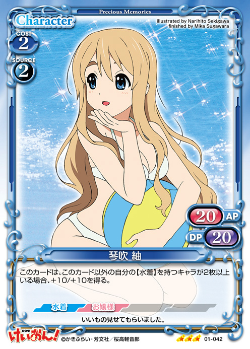 | このカードは、このカード以外の自分の【水着】を持つキャラが2枚以上いる場合、+10/+10を得る。 | ||