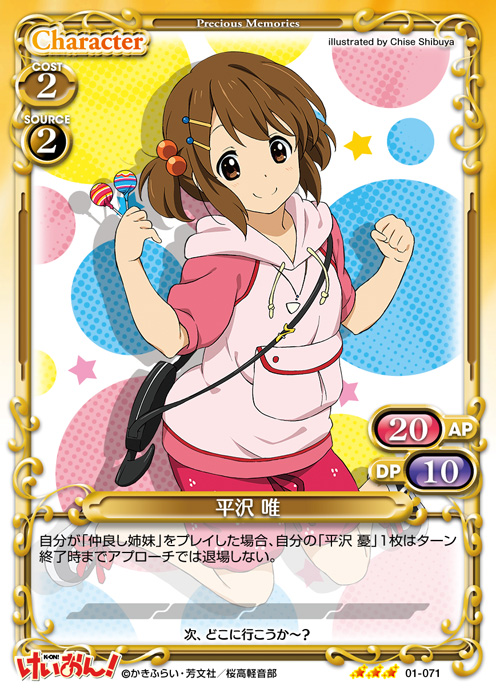 | 自分が「仲良し姉妹」をプレイした場合、自分の「平沢 憂」1枚は、ターン終了時まで、アプローチでは退場しない。 | ||