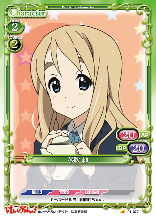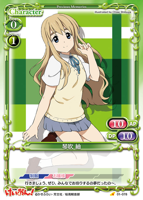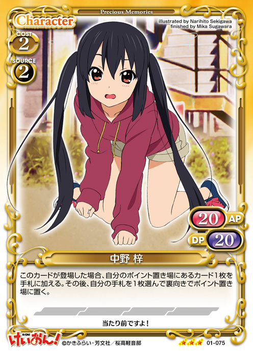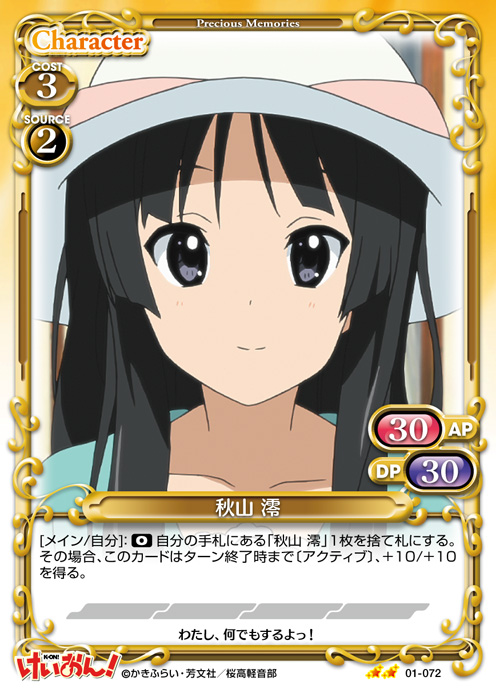 | [メイン/自分]:《0》自分の手札にある「秋山 澪」1枚を捨て札にする。その場合、このカードはターン終了時まで、〔アクティブ〕、+10/+10を得る。 | ||