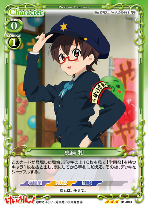 | このカードが登場した場合、デッキの上10枚を見て、【学園祭】を持つキャラ1枚を抜き出し、表にしてから手札に加える。その後、デッキをシャッフルする。 | ||