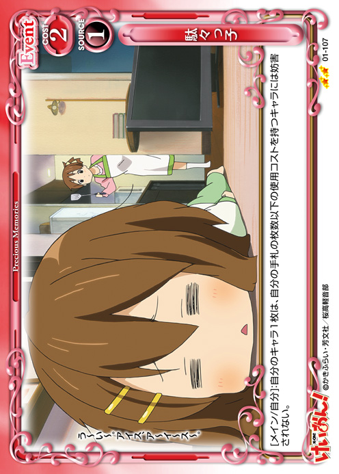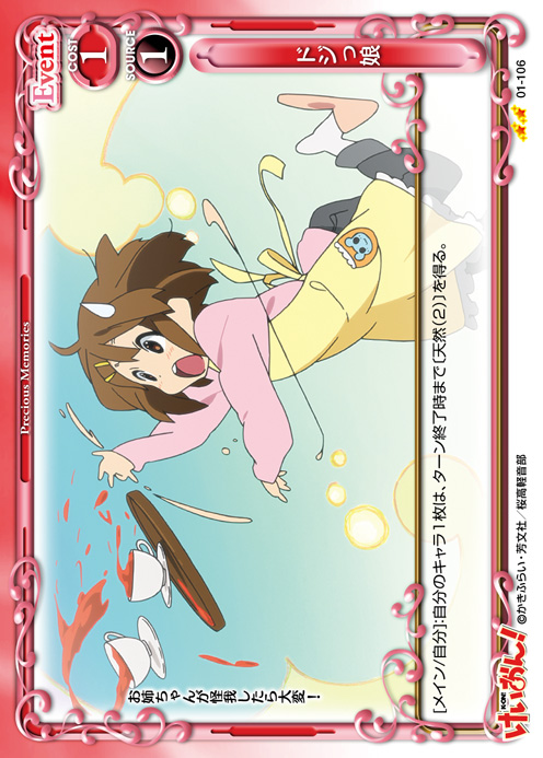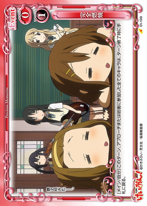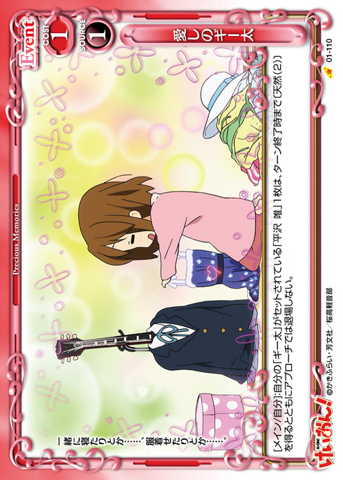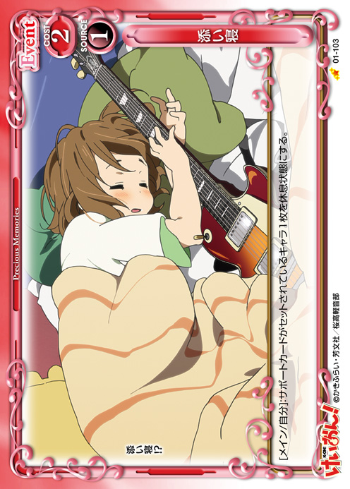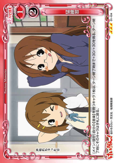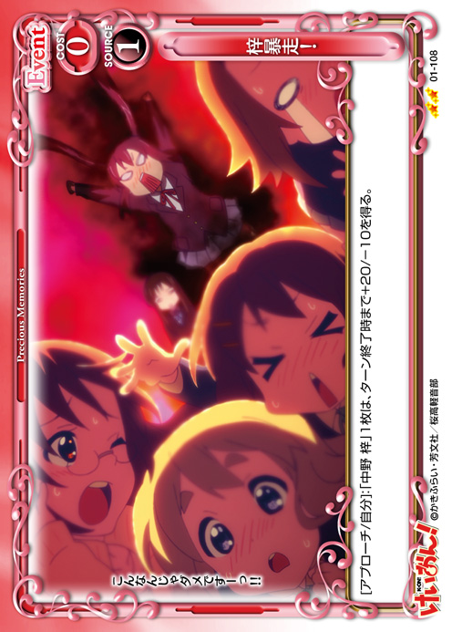 | [メイン/自分]:自分の「平沢 唯」または、「平沢 憂」を休息状態にする。その場合、自分のキャラ1枚は、ターン終了時まで+20/+20を得る。 | ||