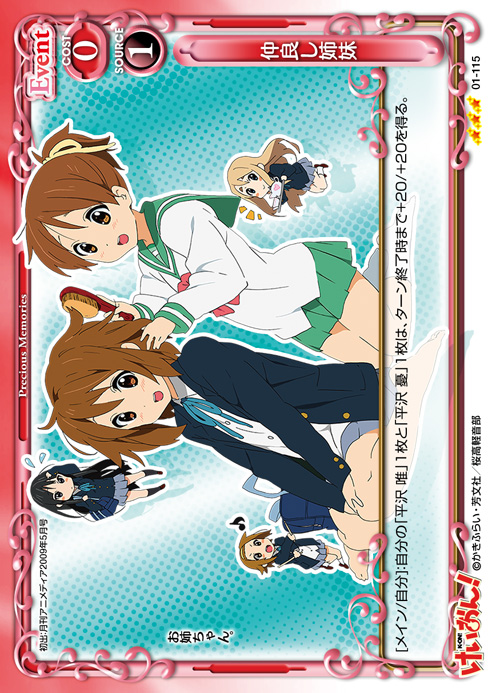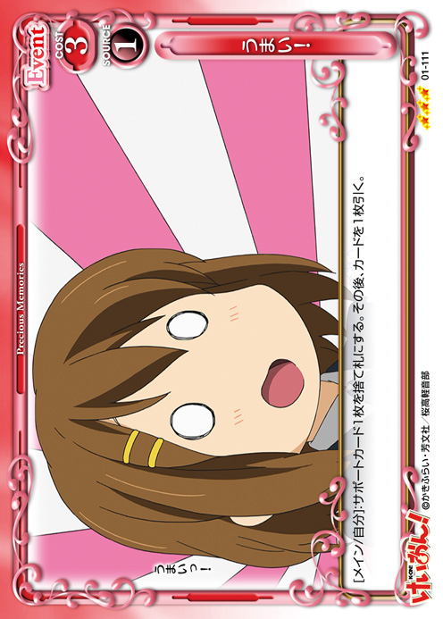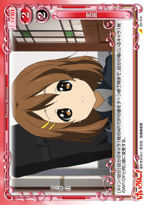 | [メイン/自分]:自分の「平沢 唯」1枚と「平沢 憂」1枚は、ターン終了時まで+20/+20を得る。 | ||