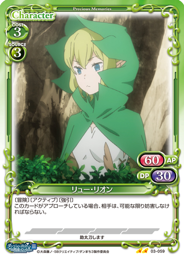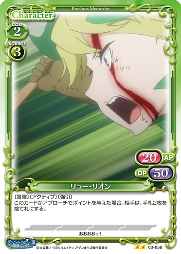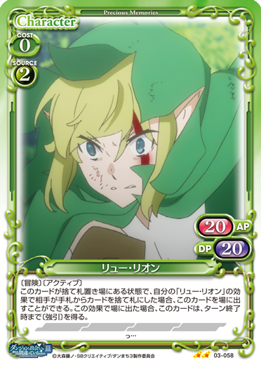 | 〔冒険〕〔アクティブ〕このカードが捨て札置き場にある状態で、自分の「リュー・リオン」の効果で相手が手札からカードを捨て札にした場合、このカードを場に出すことができる。この効果で場に出た場合、このカードは、ターン終了時まで〔強引〕を得る。 | ||