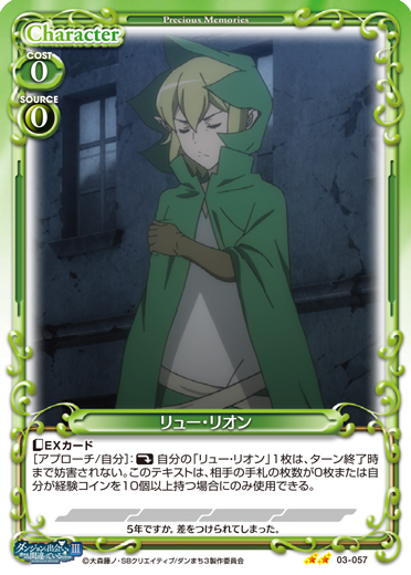 | 〔EXカード〕[アプローチ/自分]:《休》自分の「リュー・リオン」1枚は、ターン終了時まで妨害されない。このテキストは、相手の手札の枚数が0枚または自分が経験コインを10個以上持つ場合にのみ使用できる。 | ||