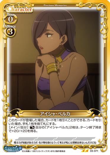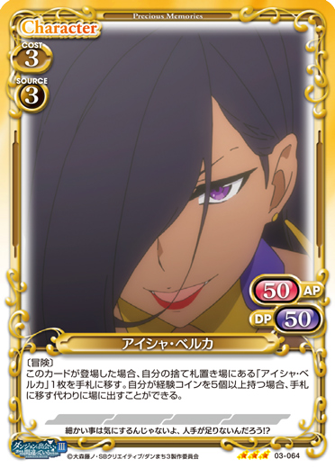 | 〔冒険〕このカードが登場した場合、自分の捨て札置き場にある「アイシャ・ベルカ」1枚を手札に移す。自分が経験コインを5個以上持つ場合、手札に移す代わりに場に出すことができる。 | ||