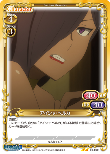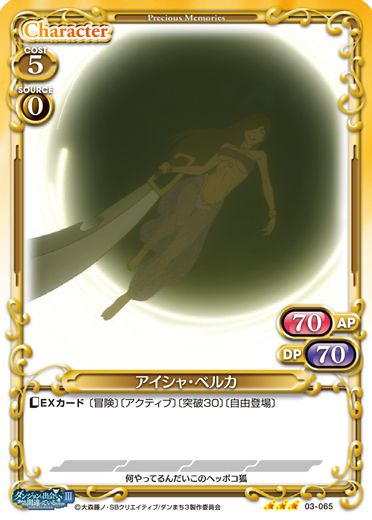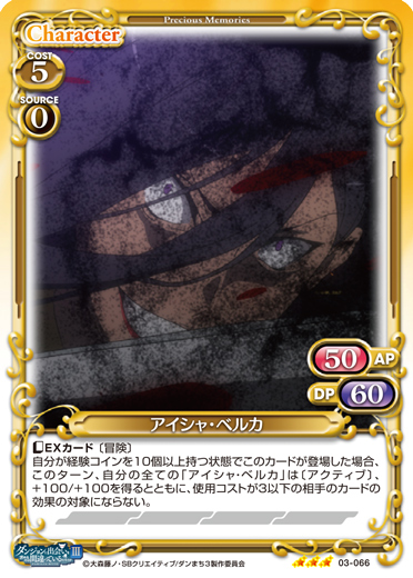 | 〔EXカード〕〔冒険〕自分が経験コインを10個以上持つ状態でこのカードが登場した場合、このターン、自分の全ての「アイシャ・ベルカ」は〔アクティブ〕、+100/+100を得るとともに、使用コストが3以下の相手のカードの効果の対象にならない。 | ||