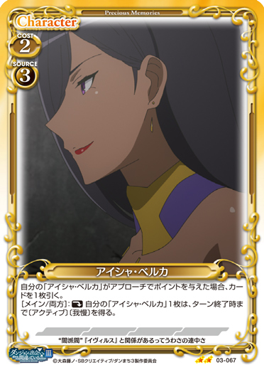 | 自分の「アイシャ・ベルカ」がアプローチでポイントを与えた場合、カードを1枚引く。[メイン/両方]:《休》自分の「アイシャ・ベルカ」1枚は、ターン終了時まで〔アクティブ〕〔我慢〕を得る。 | ||