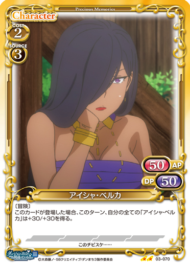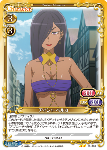 | 〔冒険〕〔アクティブ〕このカードが登場した場合、EXデッキから『ダンジョンに出会いを求めるのは間違っているだろうかⅢ』のキャラ1枚を抜き出し、手札に移す。[アプローチ/自分]:「アイシャ・ベルカ」▶このカードは、ターン終了時まで〔突破30〕を得る。 | ||