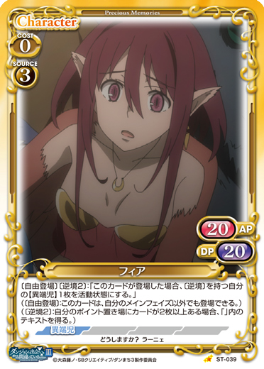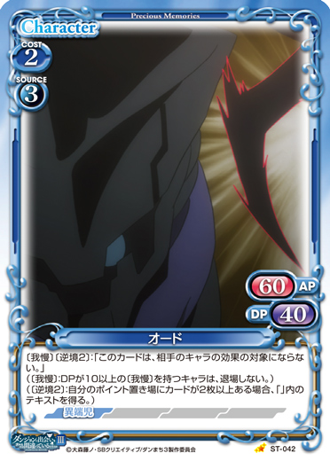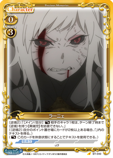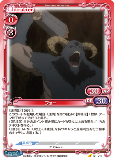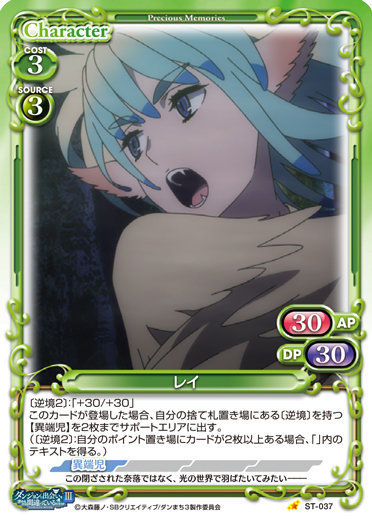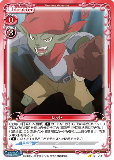 | 〔逆境2〕:「[メイン/自分]:《休》相手のキャラ1枚は、ターン終了時まで〔逆境〕を持つ【異端児】を妨害できない。」(〔逆境2〕:自分のポイント置き場にカードが2枚以上ある場合、「」内のテキストを得る。)(《休》:このカードを休息状態にすることでテキストを使用できる。) | ||