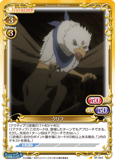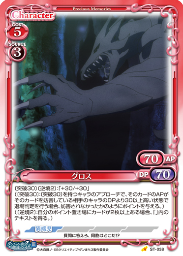 | 〔我慢〕〔逆境2〕:「このカードは、相手のキャラの効果の対象にならない。」(〔我慢〕:DPが10以上の〔我慢〕を持つキャラは、退場しない。)(〔逆境2〕:自分のポイント置き場にカードが2枚以上ある場合、「」内のテキストを得る。) | ||