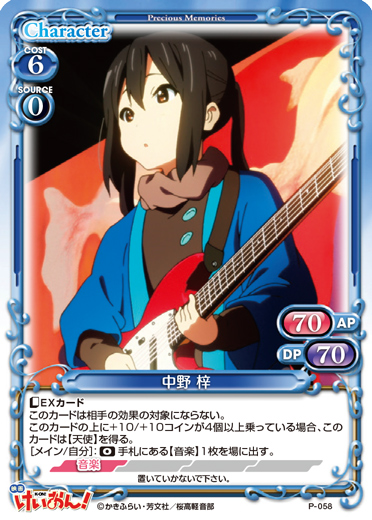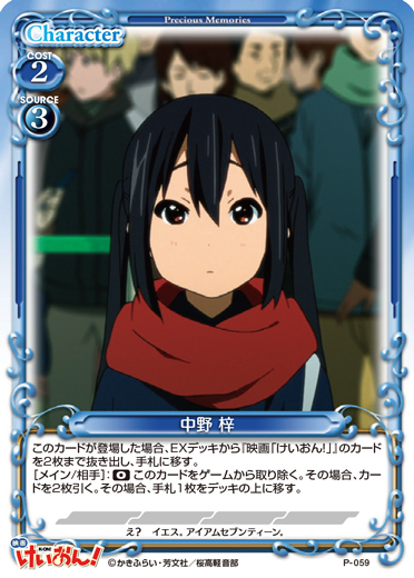 | このカードが登場した場合、EXデッキから『映画「けいおん!」』のカードを2枚まで抜き出し、手札に移す。[メイン/相手]:《0》このカードをゲームから取り除く。その場合、カードを2枚引く。その場合、手札1枚をデッキの上に移す。 | ||
