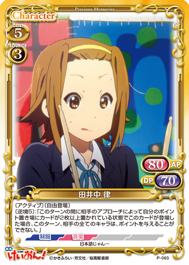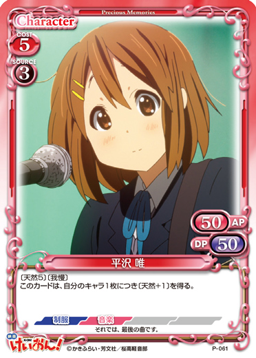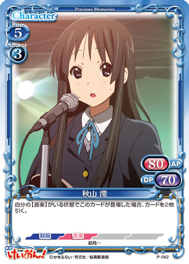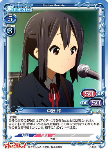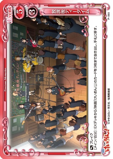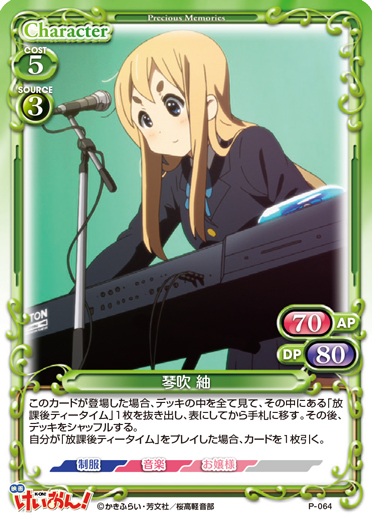 | このカードが登場した場合、デッキの中を全て見て、その中にある「放課後ティータイム」1枚を抜き出し、表にしてから手札に移す。その後、デッキをシャッフルする。自分が「放課後ティータイム」をプレイした場合、カードを1枚引く。 | ||
