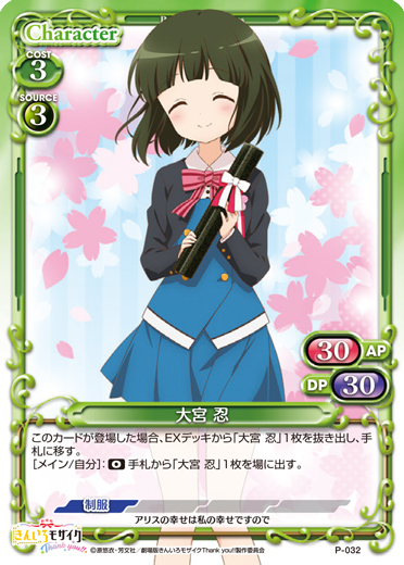 | このカードが登場した場合、EXデッキから「大宮 忍」1枚を抜き出し、手札に移す。[メイン/自分]:《0》手札から「大宮 忍」1枚を場に出す。 | ||