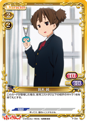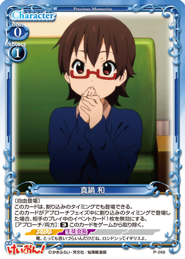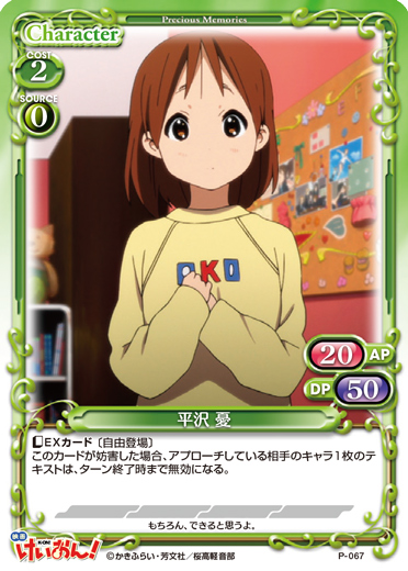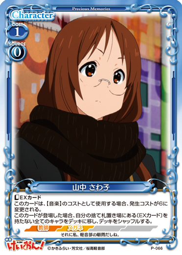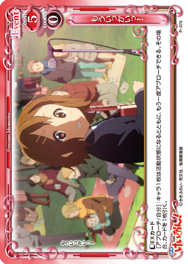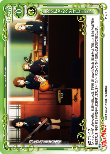 | 〔ブレイク〕[メイン/自分]:自分の捨て札置き場にある、「平沢 唯」または「秋山 澪」または「田井中 律」または「琴吹 紬」または「中野 梓」1枚を手札に移す。または+10/+10コインが1個乗った状態で場に出す。 | ||