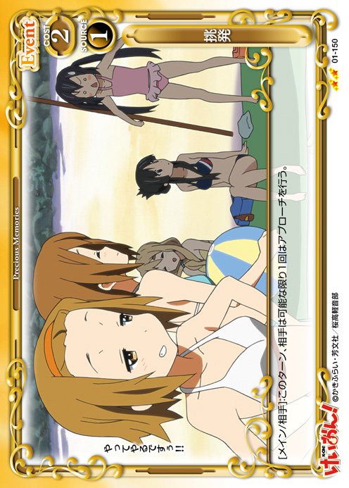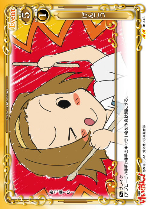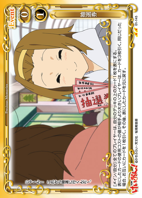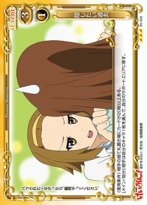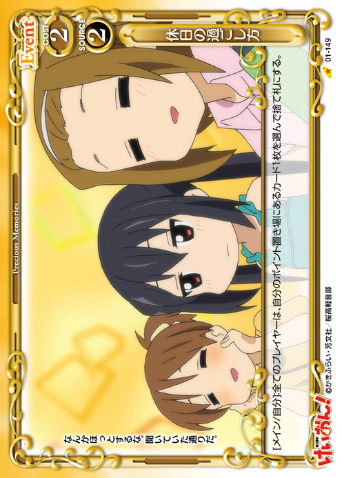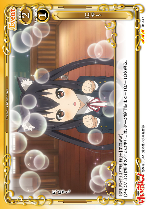 | 《使用条件》:「中野 梓」+【ネコミミ】 [メイン/自分]:相手の全てのキャラは、ターン終了時まで、-10/-10を得る。 | ||