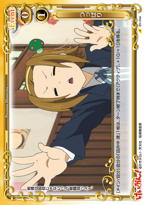 | [メイン/自分]:自分の「田井中 律」1枚は、ターン終了時まで〔アクティブ〕、+10/+10を得る。 | ||
