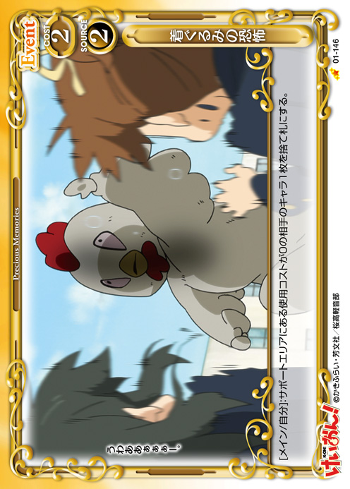 | [メイン/自分]:サポートエリアにある、使用コストが0の相手のキャラ1枚を捨て札にする。 | ||