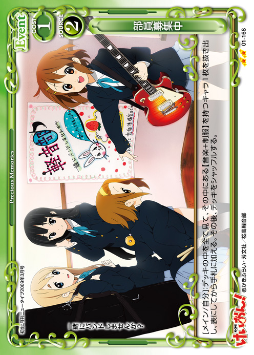 | [メイン/自分]:デッキの中を全てを見て、その中にある【音楽+制服】を持つキャラ1枚を抜き出し、表にしてから手札に加える。その後、デッキをシャッフルする。 | ||