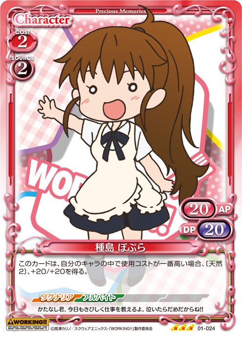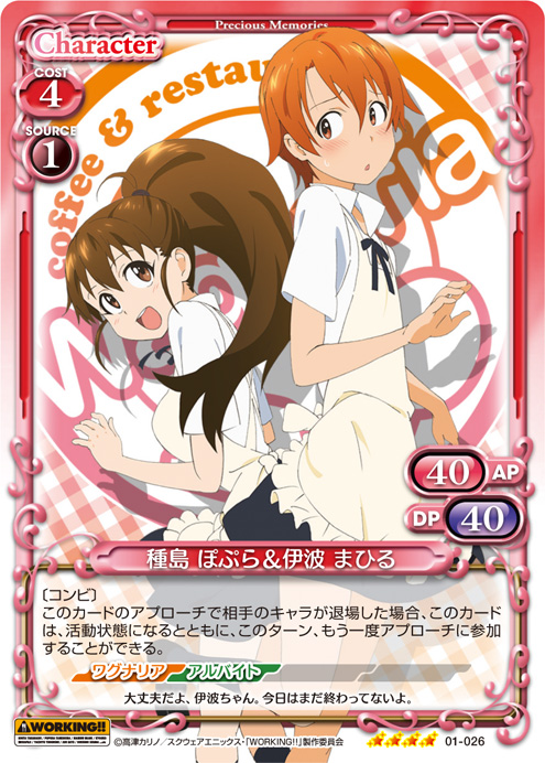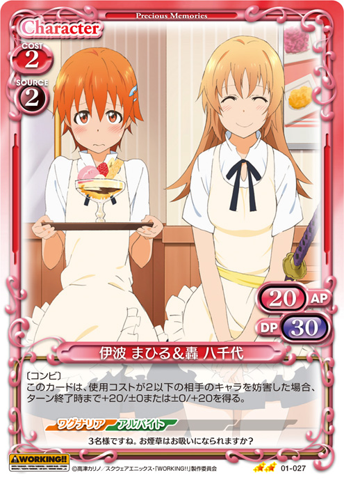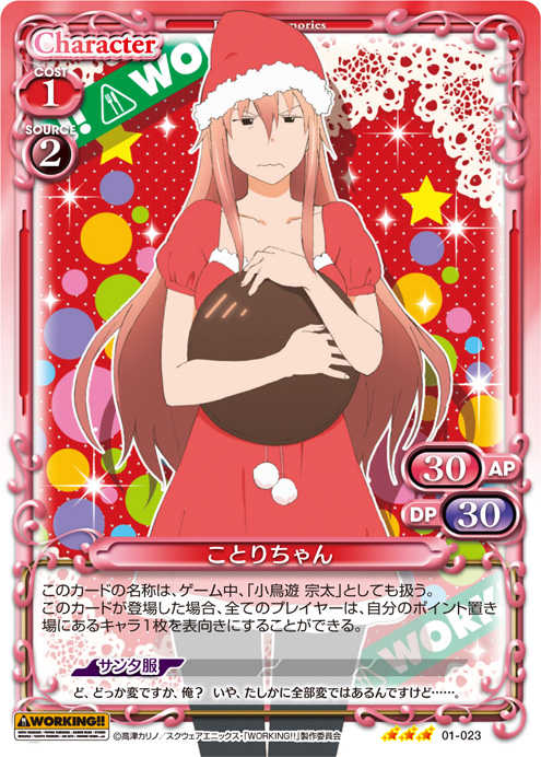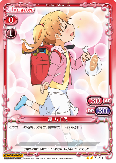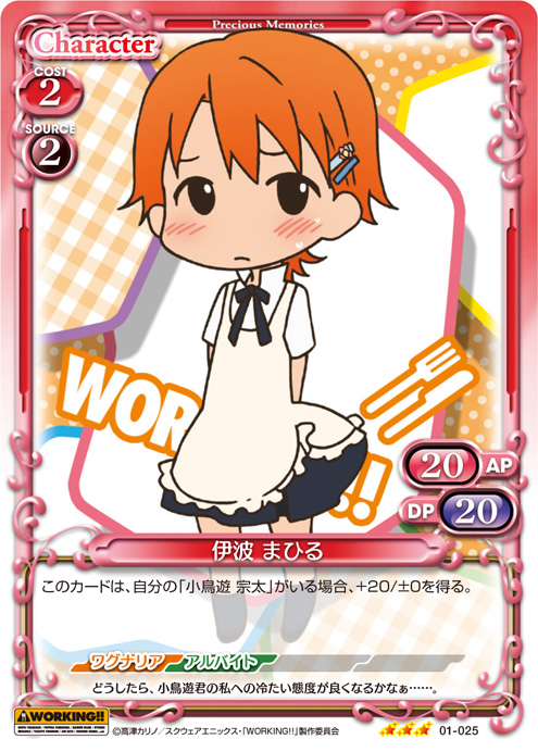 | このカードが登場した場合、キャラ1枚のAP/DPの値を、ターン終了時まで0/0に変更する。[メイン/自分]:《0》このカードのAP/DPの値を、ターン終了時まで自分の『WORKING!!』のキャラ1枚のAP/DPと同じ値に変更する。 | ||