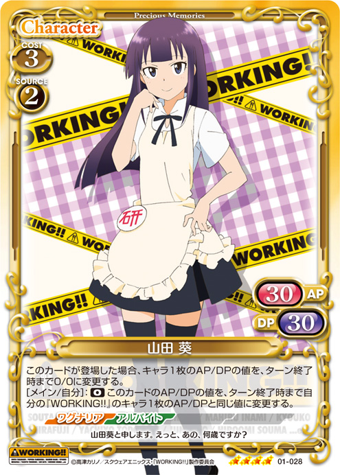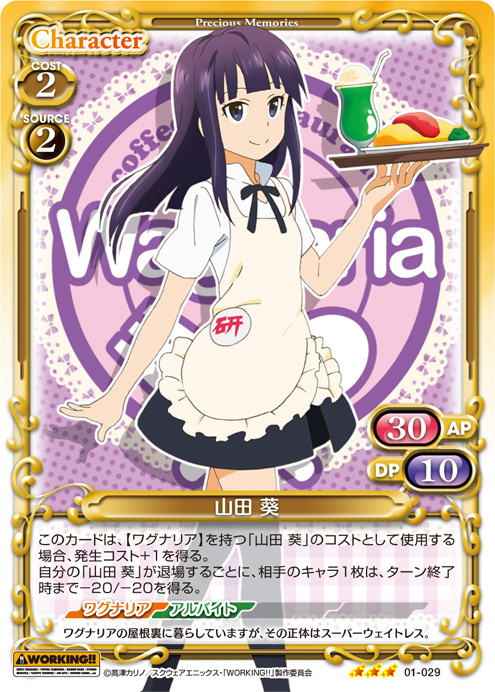 | このカードは、【ワグナリア】を持つ「山田 葵」のコストとして使用する場合、発生コスト+1を得る。自分の「山田 葵」が退場するごとに、相手のキャラ1枚は、ターン終了時まで-20/-20を得る。 | ||