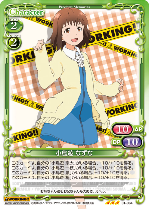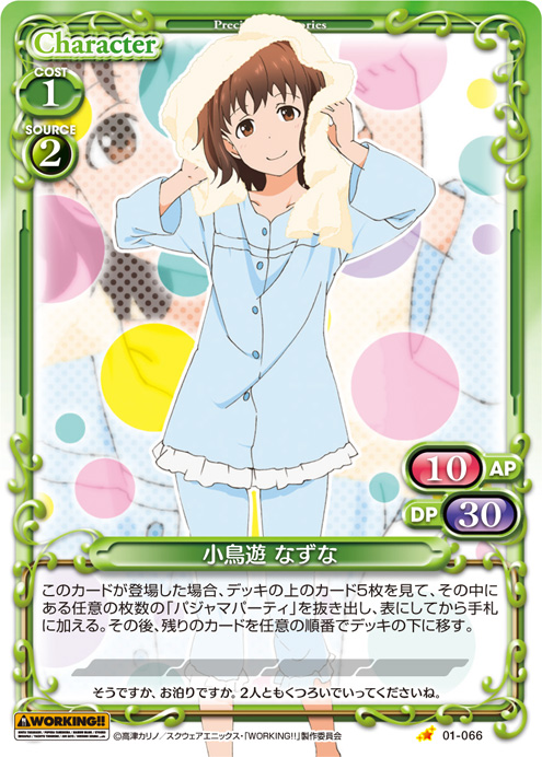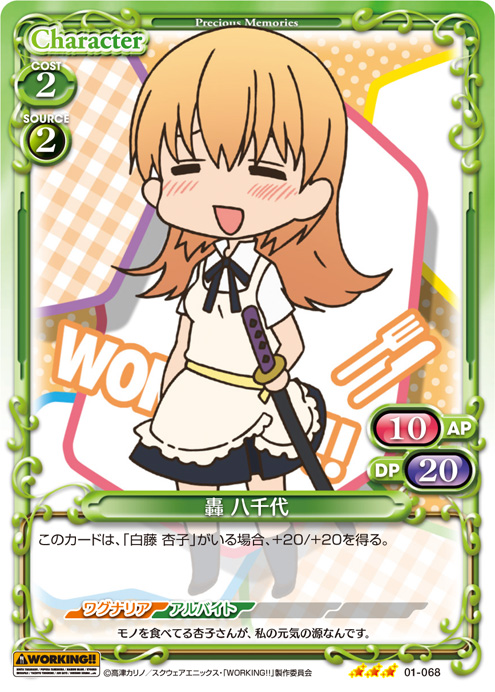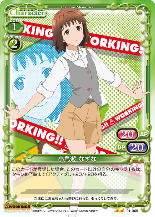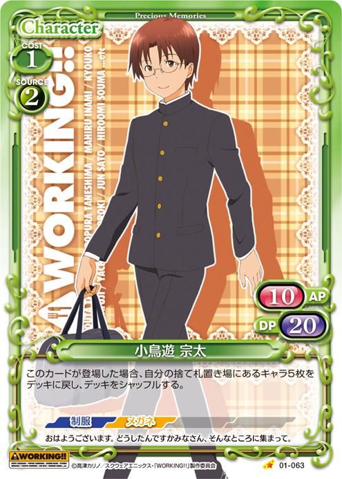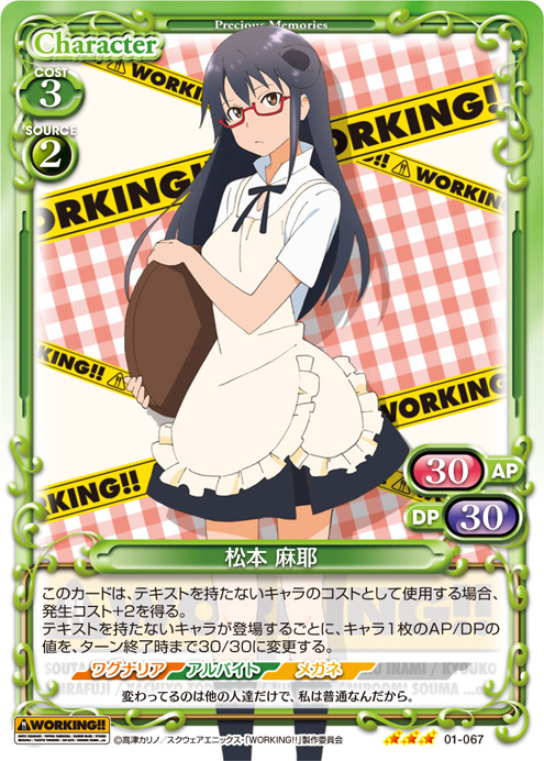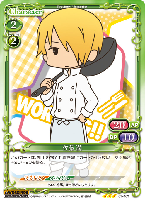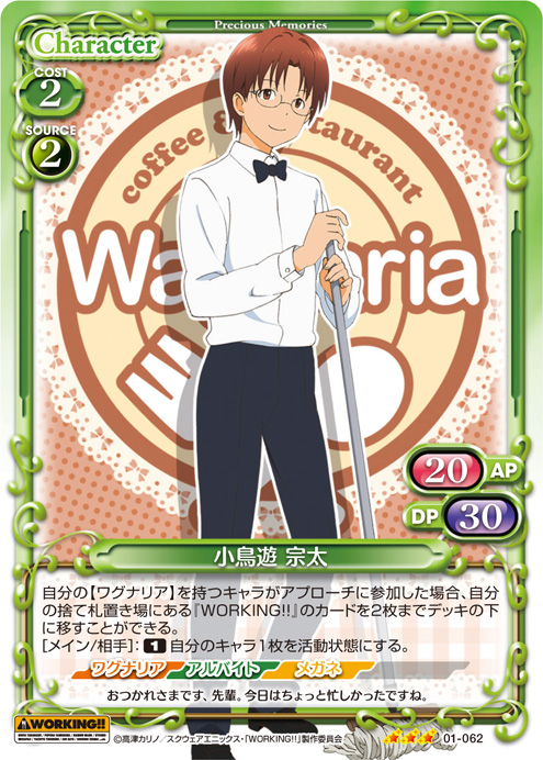 | 自分の【ワグナリア】を持つキャラがアプローチに参加した場合、自分の捨て札置き場にある『WORKING!!』のカードを2枚までデッキの下に移すことができる。[メイン/相手]:《1》自分のキャラ1枚を活動状態にする。 | ||