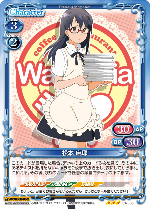 | このカードが登場した場合、デッキの上のカード6枚を見て、その中にあるテキストを持たないキャラを2枚まで抜き出し、表にしてから手札に加える。その後、残りのカードを任意の順番でデッキの下に移す。 | ||