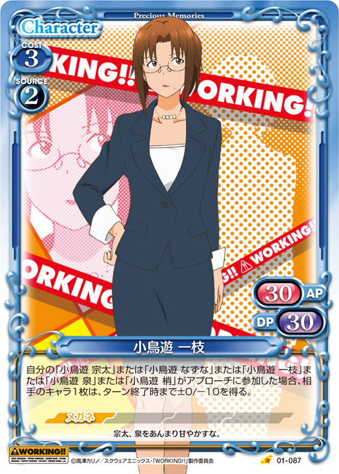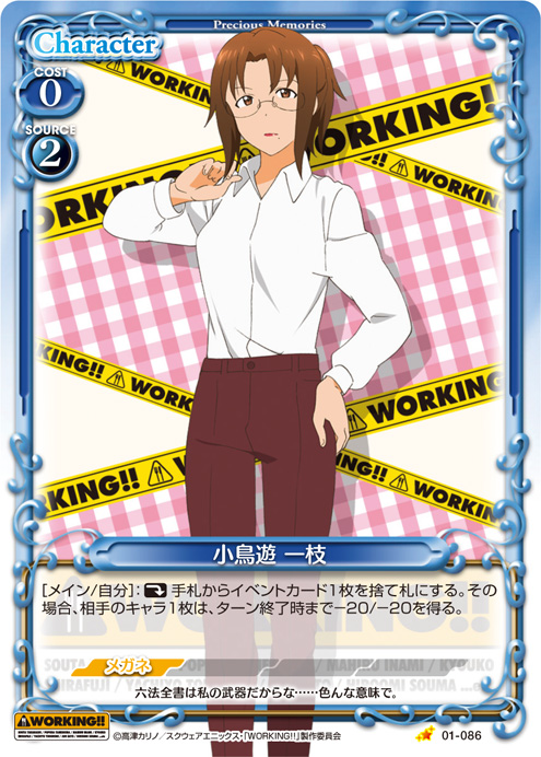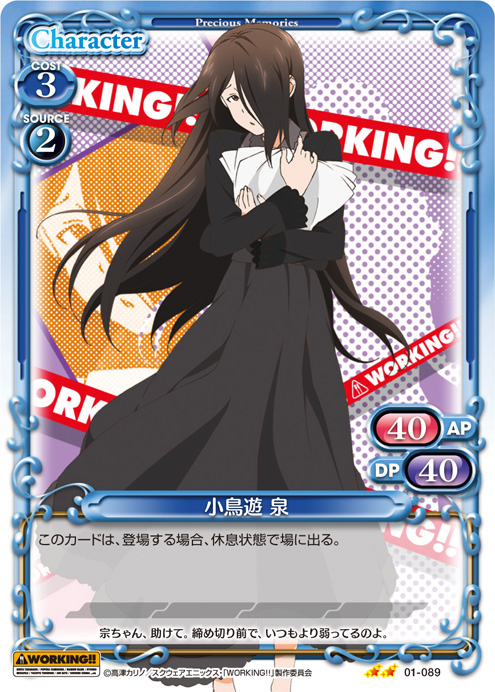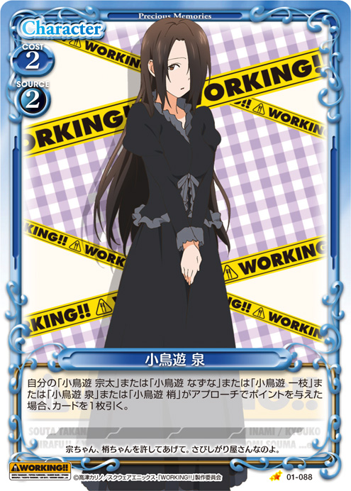 | このカードが登場した場合、このターン、自分が次にプレイする「小鳥遊 一枝」または「小鳥遊 泉」または「小鳥遊 梢」1枚は、使用コスト-3を得る。 | ||