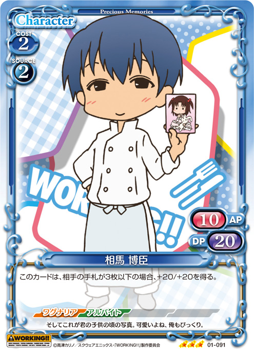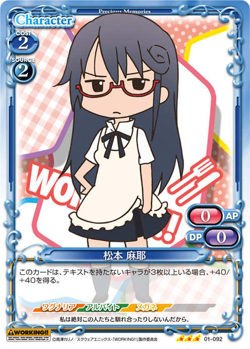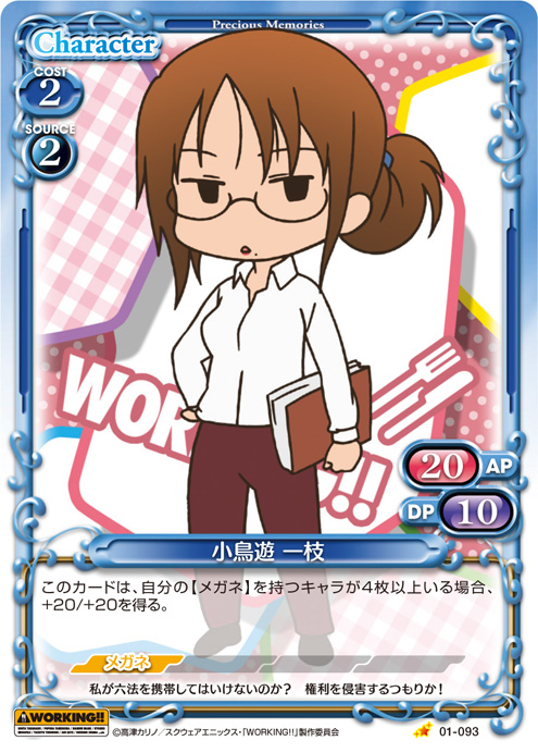 | このカードは、自分の【メガネ】を持つキャラが4枚以上いる場合、+20/+20を得る。 | ||