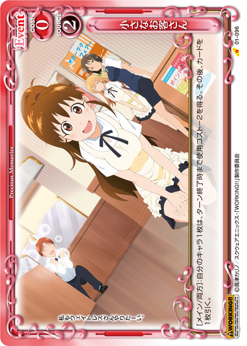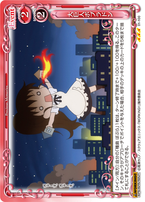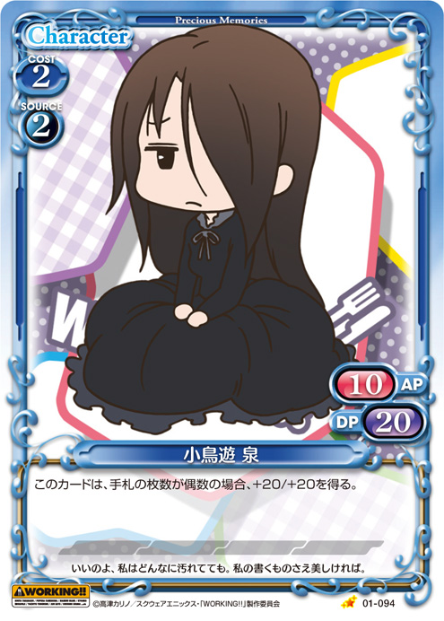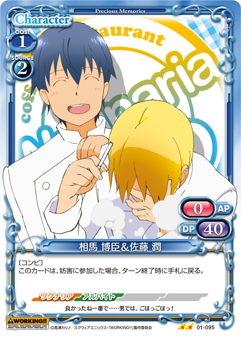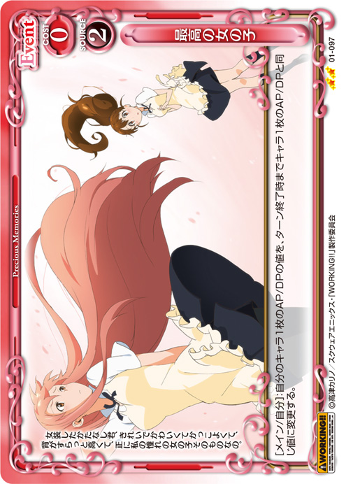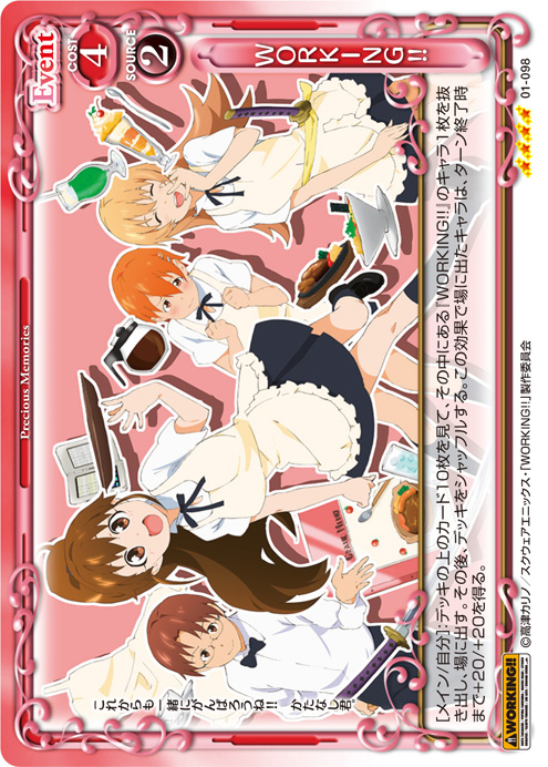 | [メイン/自分]:デッキの上のカード10枚を見て、その中にある『WORKING!!』のキャラ1枚を抜き出し、場に出す。その後、デッキをシャッフルする。この効果で場に出たキャラは、ターン終了時まで+20/+20を得る。 | ||