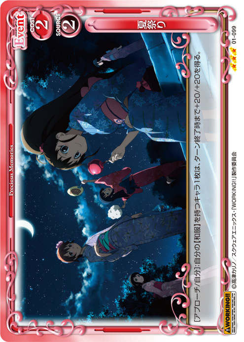 | [アプローチ/自分]:自分の【和服】を持つキャラ1枚は、ターン終了時まで+20/+20を得る。 | ||