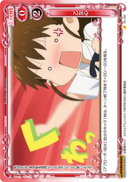 | [アプローチ/自分]:自分のキャラ1枚は、ターン終了時まで+20/-20を得る。 | ||
