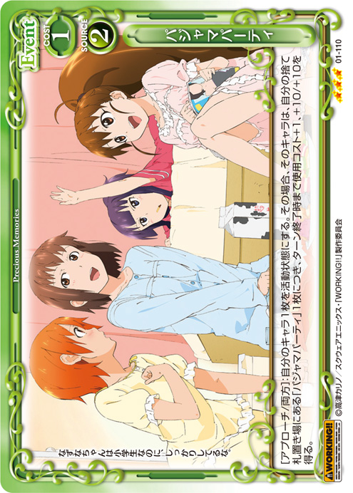 | [アプローチ/両方]:自分のキャラ1枚を活動状態にする。その場合、そのキャラは、自分の捨て札置き場にある「パジャマパーティ」1枚につき、ターン終了時まで使用コスト+1、+10/+10を得る。 | ||